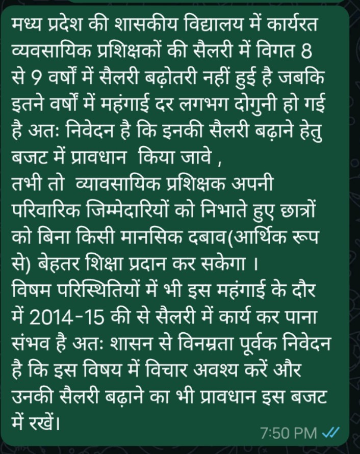 मध्य प्रदेश की शासकीय विद्यालय में कार्यरत व्यवसायिक प्रशिक्षकों की सैलरी में विगत 8 से 9 वर्षों में सैलरी बढ़ोतरी नहीं हुई है जबकि इतने वर्षों में महंगाई दर लगभग दोगुनी हो गई है अतः निवेदन है कि इनकी सैलरी बढ़ाने हेतु बजट में प्रावधान किया जावे,तभी तो व्यावसायिक प्रशिक्षक अपनी परिवारिक जिम्मेदारियों को निभाते हुए छात्रों को बिना किसी मानसिक दबाव(आर्थिक रूप से) बेहतर शिक्षा प्रदान कर सकेगा ।विषम परिस्थितियों में भी इस महंगाई के दौर में 2014-15 की से सैलरी में कार्य कर पाना संभव है अतः शासन