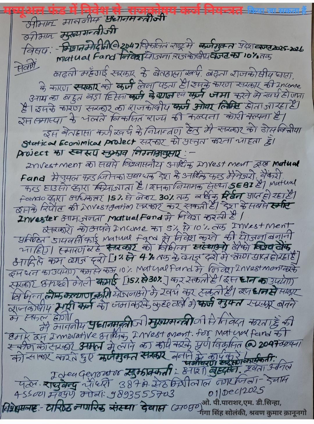मैं माननीय प्रधानमंत्रीजी व मुख्यमंत्रिजी से निवेदन करता हूँ कि इसमें एक Innovative & Safe Investment के सुझाव आईडिया को अमल लाने का कार्य करके, पूर्ण विकसित @2047 की कल्पना को साकार करतें हुए, राजकोषीय कर्ज मुक्त सरकार बनाने का कार्य करें|