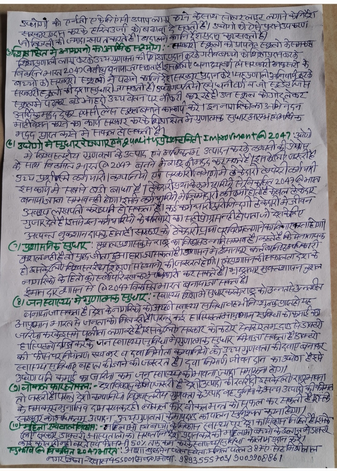 2. विद्युत ऊर्जा के क्षेत्र में गुणात्मक सुधार जैसे-स्मार्ट मीटर, एव्हरेज बिल की जगह एक्च्युअल बिल, विद्युत के पुराने तारों के स्थान पर केबल तार स्थापित करने, सडकों के मध्य आने वाले पोल को प्रतिस्थापित करने, अस्थाई विद्युत कनेक्शनों को स्थाई विद्युत कनेक्शनों में परिवर्तित करने हेतु तथ्यात्मक सुझाव