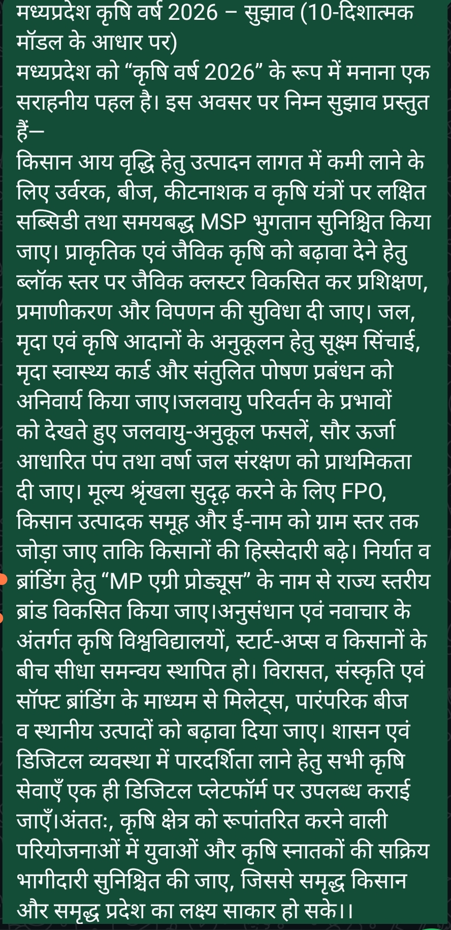 मध्यप्रदेश को “कृषि वर्ष 2026” के रूप में मनाना एक सराहनीय पहल है। इस अवसर पर निम्न सुझाव प्रस्तुत हैं—