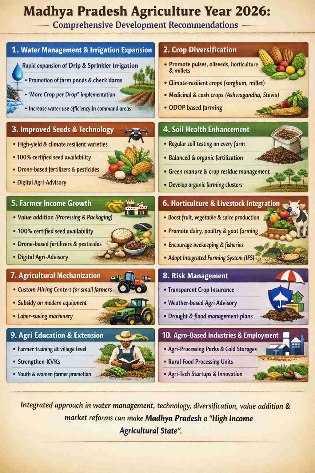 मध्यप्रदेश कृषि वर्ष 2026 में कृषि के समग्र विकास के लिए सबसे जरूरी है कि राज्य में पानी, मिट्टी, तकनीक और बाजार—इन चारों पर एक साथ काम किया जाए। सबसे पहले सिंचाई व्यवस्था को मजबूत करना जरूरी है, इसके लिए ड्रिप और स्प्रिंकलर जैसी माइक्रो इरिगेशन तकनीक को बढ़ावा देना चाहिए, साथ ही गाँव-गाँव में तालाब, डबरी और फार्म पॉन्ड बनाकर बारिश के पानी को संग्रहित करना चाहिए। मिट्टी की सेहत सुधारने के लिए Soil Health Card को नियमित अपडेट किया जाए और किसानों को जैविक खाद, वर्मी कम्पोस्ट तथा हरी खाद के उपयोग.