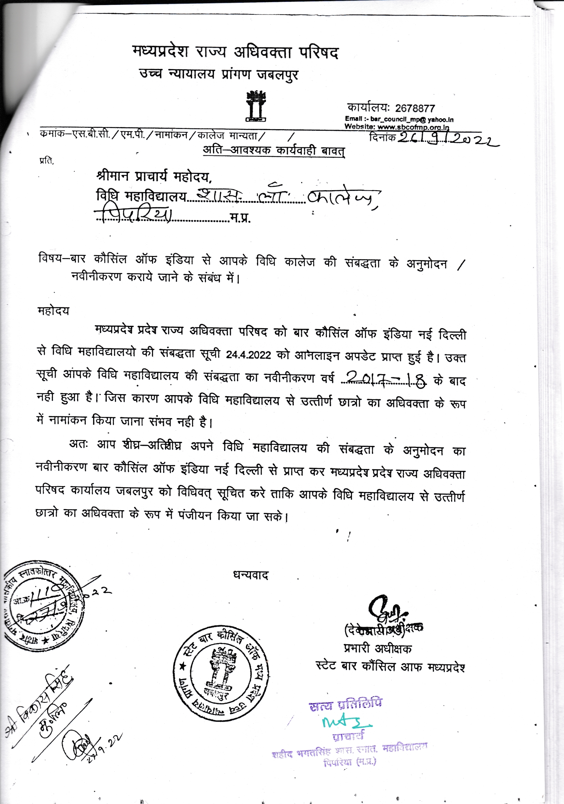 श्री मान मेरा सूझाव है की शासकीय शाहिद भगतसिंह (लॉ) महाविद्यालय पिपरिया जिला नर्मदापुरम म.प्र.की BCI नई दिल्ली से वर्ष 2018-19 से वर्ष 2022 तक कि या आगामी वर्ष की मान्यता का नवीनीकरण कराने की कृपा करें जिससे की वर्ष 2022.LLB उत्तीर्ण छात्रों का पंजीयन हो सके अधिवक्ता के रूप में और अपना विधि व्यवासय सुरु कर सकें और आत्मनिर्भर बन सकें,और श्रीमान महाविद्यालय प्रबंधक पर उचित कार्यवाही करें क्योंकि इनकी लापरवाही के कारण LLB उत्तीर्ण छात्र विधि व्यवासय नहीं कर पा रहें है और आत्मनिर्भर नहीं बन पा रहें