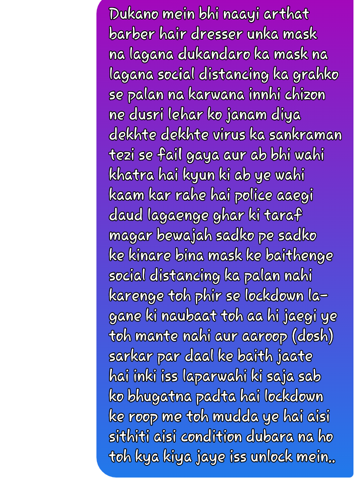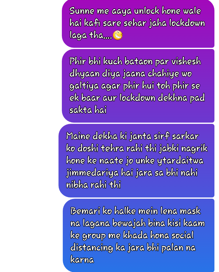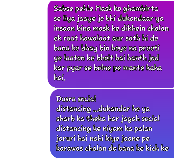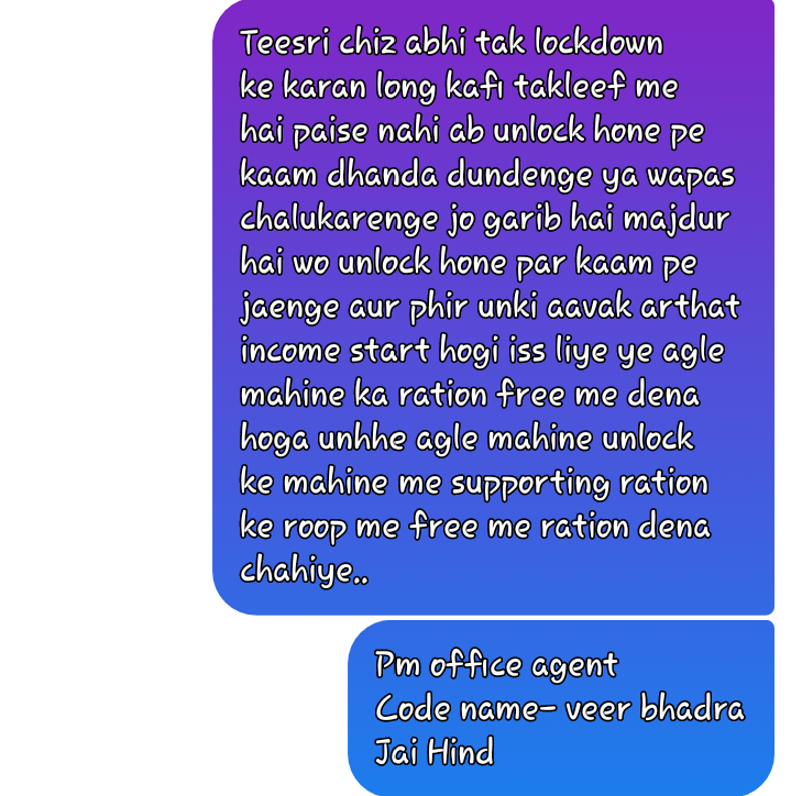 माननीय मुख्यमंत्री जी को प्रणाम,आप जैसे मुख्यमंत्री हमे मिले ये हमारे सोभाग्य की बात है | मेरा कोराना कर्फ्यू खोलने को लेकर यह सुझाव है की अभी 6 महीने तक शादी,भगवत कथा,सम्मेलन,आम सभाए,धारणा प्रदर्शन आदि जिसमे 200 से अधिक व्यक्ति सामिल होते है उसकी अनुमति बिल्कुल न मिले ओर साप्ताहिक हाट बाजार फल सब्जी पशु आदि के 2 महीने बिल्कुल न खोले | हम जैसे दुकानदार का जरूर ध्यान रखे | घर लोन से बनाया उसकी किस्त हर महीने आती है | लॉक डाउन से बहुत परेसन हो गए
