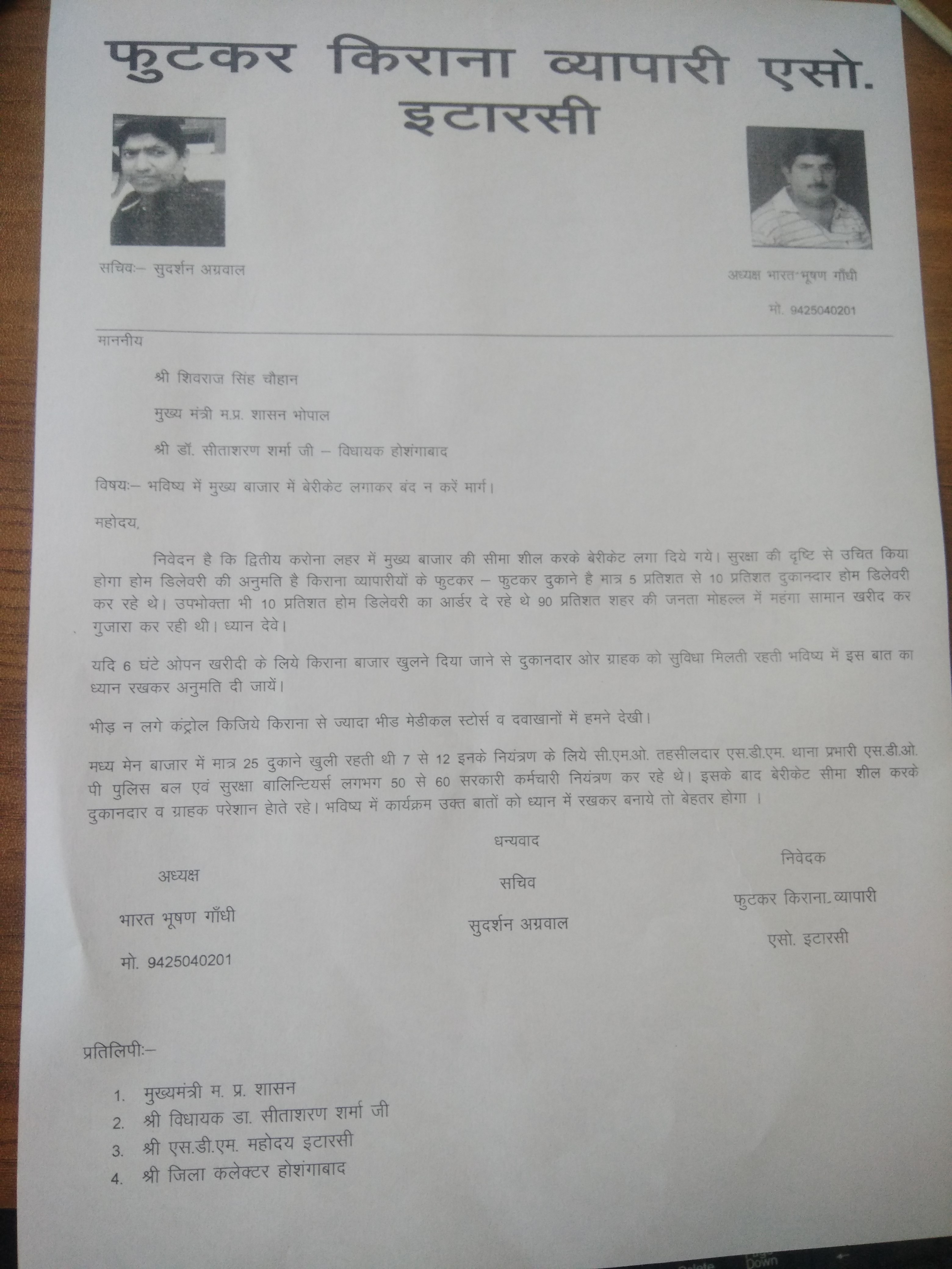 आशा करता हूँ कि आप उचित निर्णय लेकर समस्त मॉल दुकानदारों और कार्यरत कर्मचारियों के परिवार सञ्चालन में मदद करेंगे।