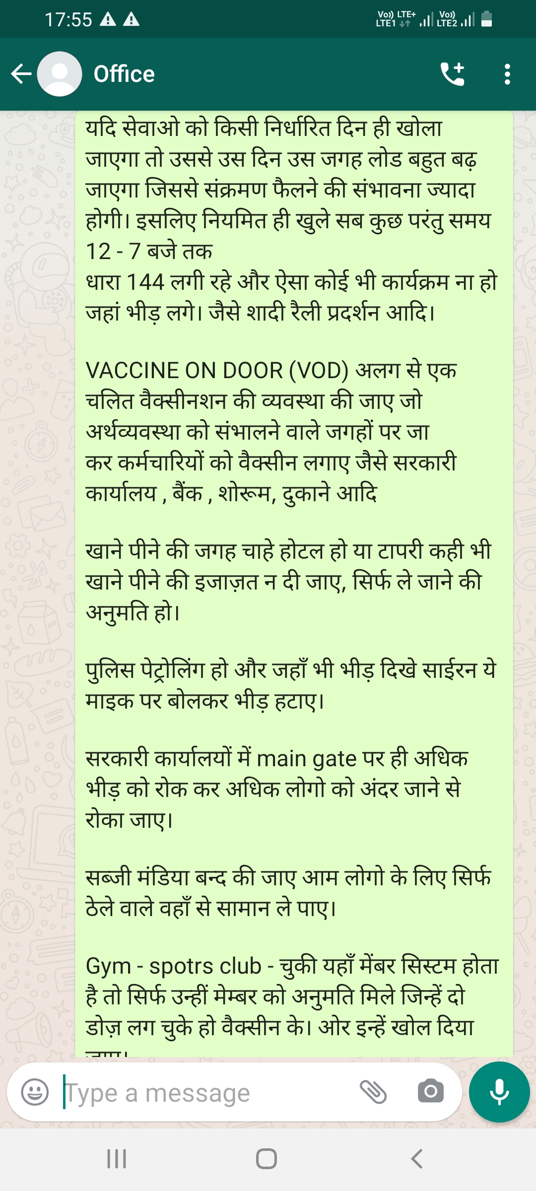 अनलॉक की प्रक्रिया चालू करने के लिए शासन प्रशासन से निवेदन है जिन दुकानदार भाइयों को व कर्मचारियों को वैक्सीन लग गया है पहले उन्हें ही परमिशन दी जावे एवं कोशिश करके जो लोग वेक्सीनेटेड हो गए उन्हें ही घर से बाहर निकलने की परमिशन दि जाए सभी लोग अपने सर्टिफिकेट साथ में रखेंगे दुकानदारों कर्मचारी दुकानो पर अपना वेक्सीनेटेड सर्टिफिकेट लगाकर रखेंगे । ठेले वाले व सब्जी वालों पर भी यह नियम लागू करें । इसके 2 फ़ायदे होंगे एक तो सभी लोग अपना प्रतिष्ठान खोलने के लिए वैक्सीन लगवाएँगे दूसरा जो लोग अपने कार्य