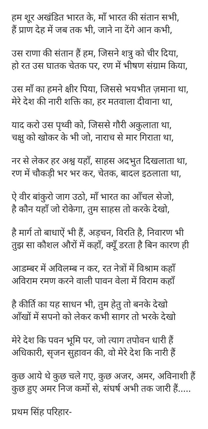 यह कविता देशभक्ति के भाव से ओतप्रोत काव्य रचना है| देश के वीरो की यह गाथा हम भारतीयों के लिए एक गौरवगान है| इस कविता में हमारे देश की नारी शक्ति का भी बखान किया गया है| साथ ही यह काव्य रचना अलंकारो को भी ध्यान में रखते हुए ,वीर रस से परिपूर्ण,व्याकरणसम्मत शब्दों में लिखी गयी है|जो भारतीय युवा वीरो को उनके लक्ष्य और देशप्रेम के भाव में रम देगी|