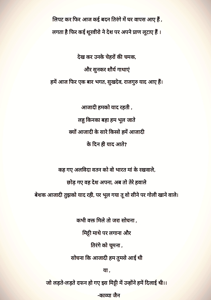 देशप्रेमीयो ने क्रांति बन अवतार लिया कर्ज़ चुकाकर मिट्टी का इस धरती को अपने लहू से तार दिया।स्वाधीनता की इस बेल मे स्त्रियों ने भी साथ दिया।अपने कोमल हाथो मे तलवारों को थमा दिया।धरती की आन के खातिर,अपने स्वाभिमान के खातिर, उन वीरो ने भी साथ दिया,घर मे जिनकी बूढ़ी माँ दरवाज़े को निहारती थी,नई नवेली जिनकी दुल्हन पलके बिछाये बेठी थी, बच्चे जिनके छोटे-छोटे भाई-बहन भी थे प्यारे,फ़र्ज़ अगर ना होता तो वो भी अपने घर मे होते।।