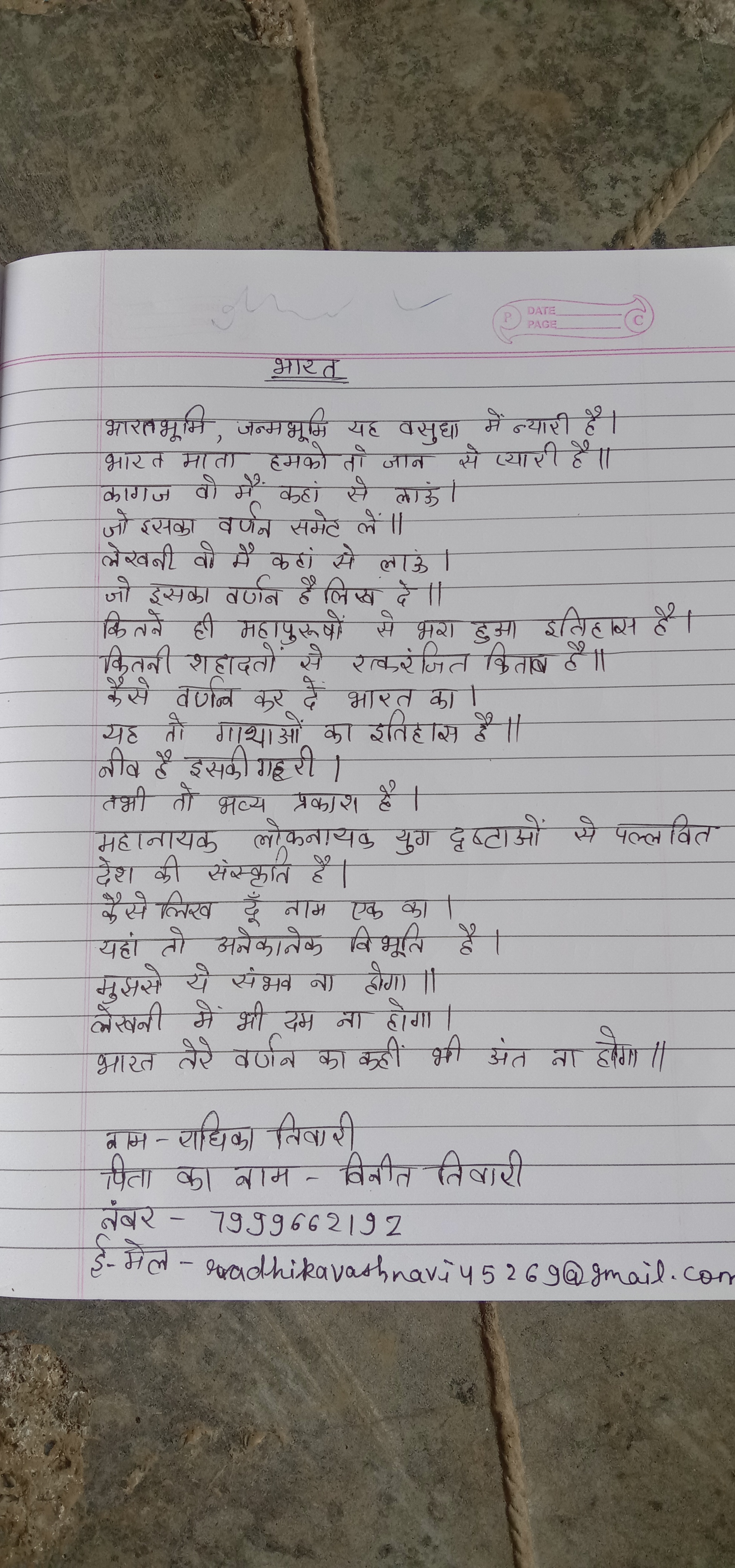 Respected Sir I Manali Deshpande has taken part in this competition and attached pdf file of my poem on the topic swadhinta parva in hindi language for your kind consideration. Thank you.