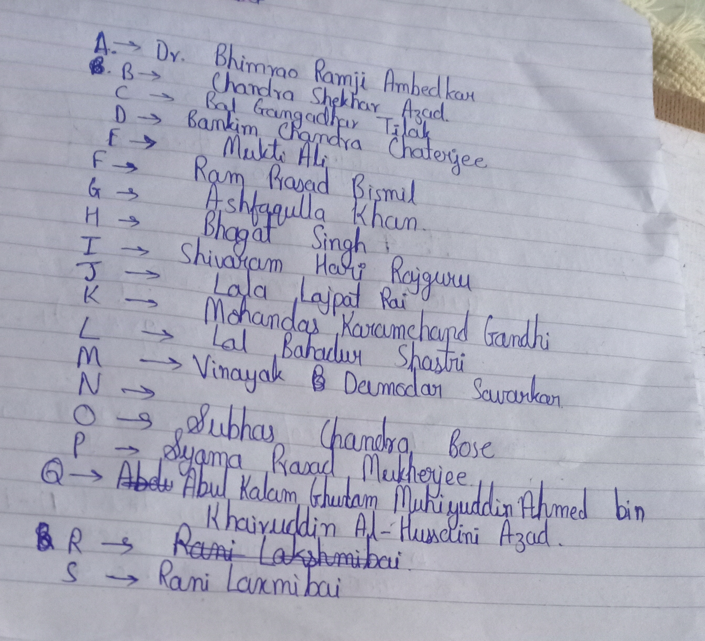 F-राजगुरु H-भगतसिंह I-सुखदेव k-महात्मा गांधी L-लाल बहादुर शास्त्री