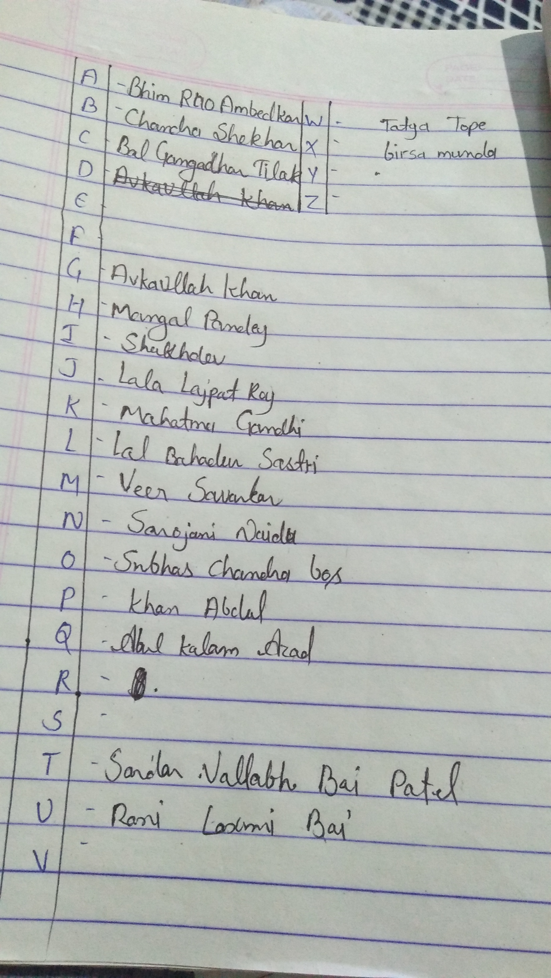 T-सरदार वल्लभ भाई पटेल U-लक्ष्मीबाई V-टांट्या भील