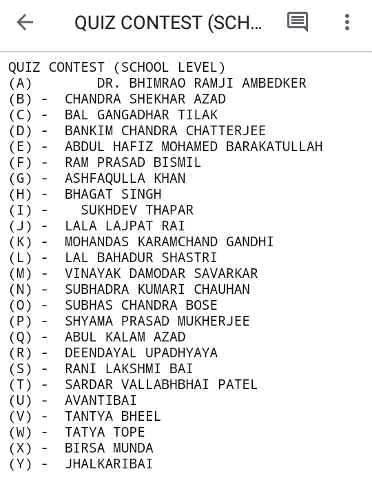 क्विज कांटेस्ट के माध्यम से विद्यार्थियों को स्वतंत्रता के रणवाकुरो के विषय मे महत्वपूर्ण जानकरी प्राप्त हुई, अतः यह हमारे देश के भविष्य (विद्यार्थियों )को देशभक्ति व राष्ट्रीय एकता की प्रेरणा देने मे अत्यंत सहायक सिद्ध हुआ है |