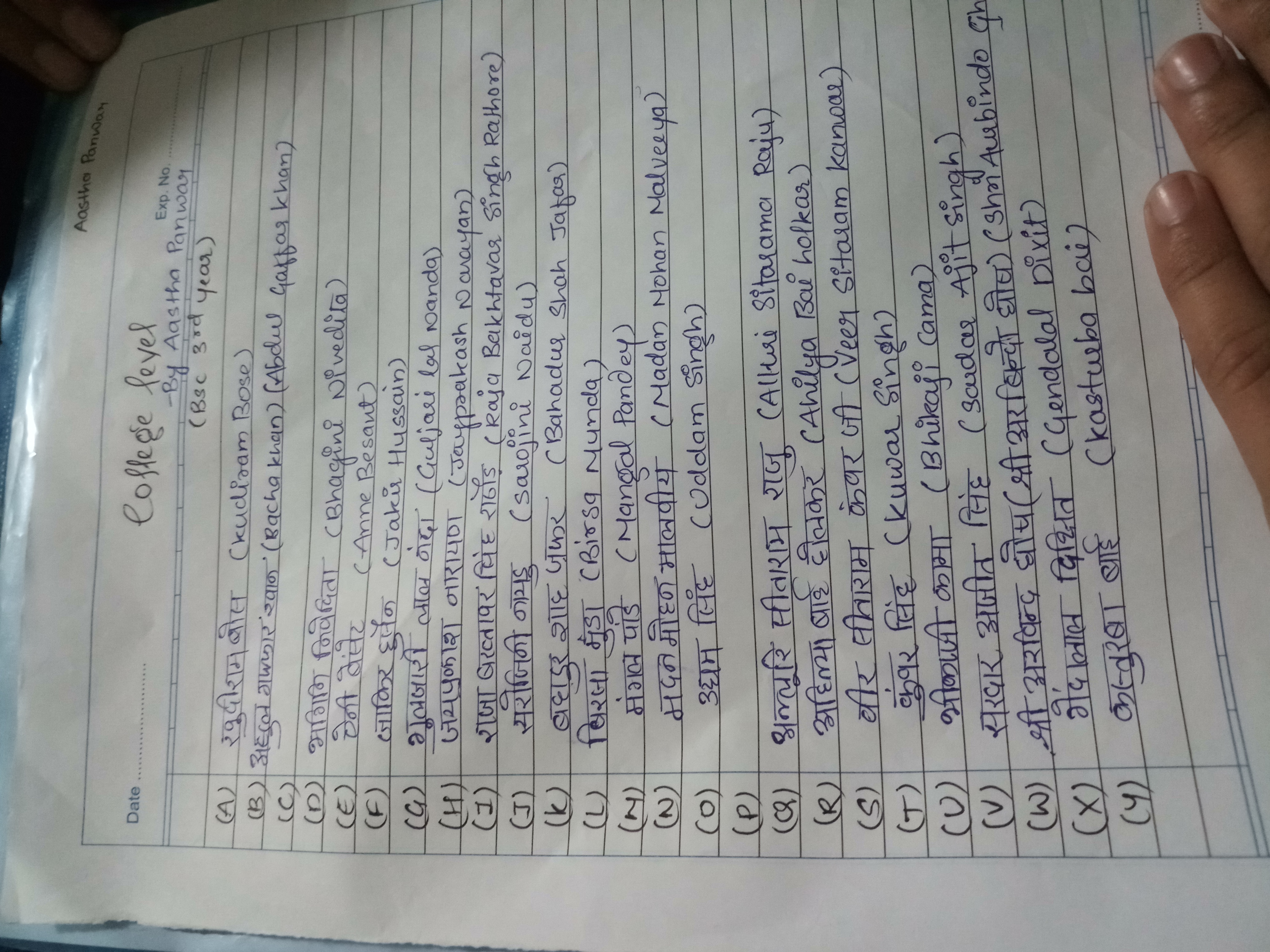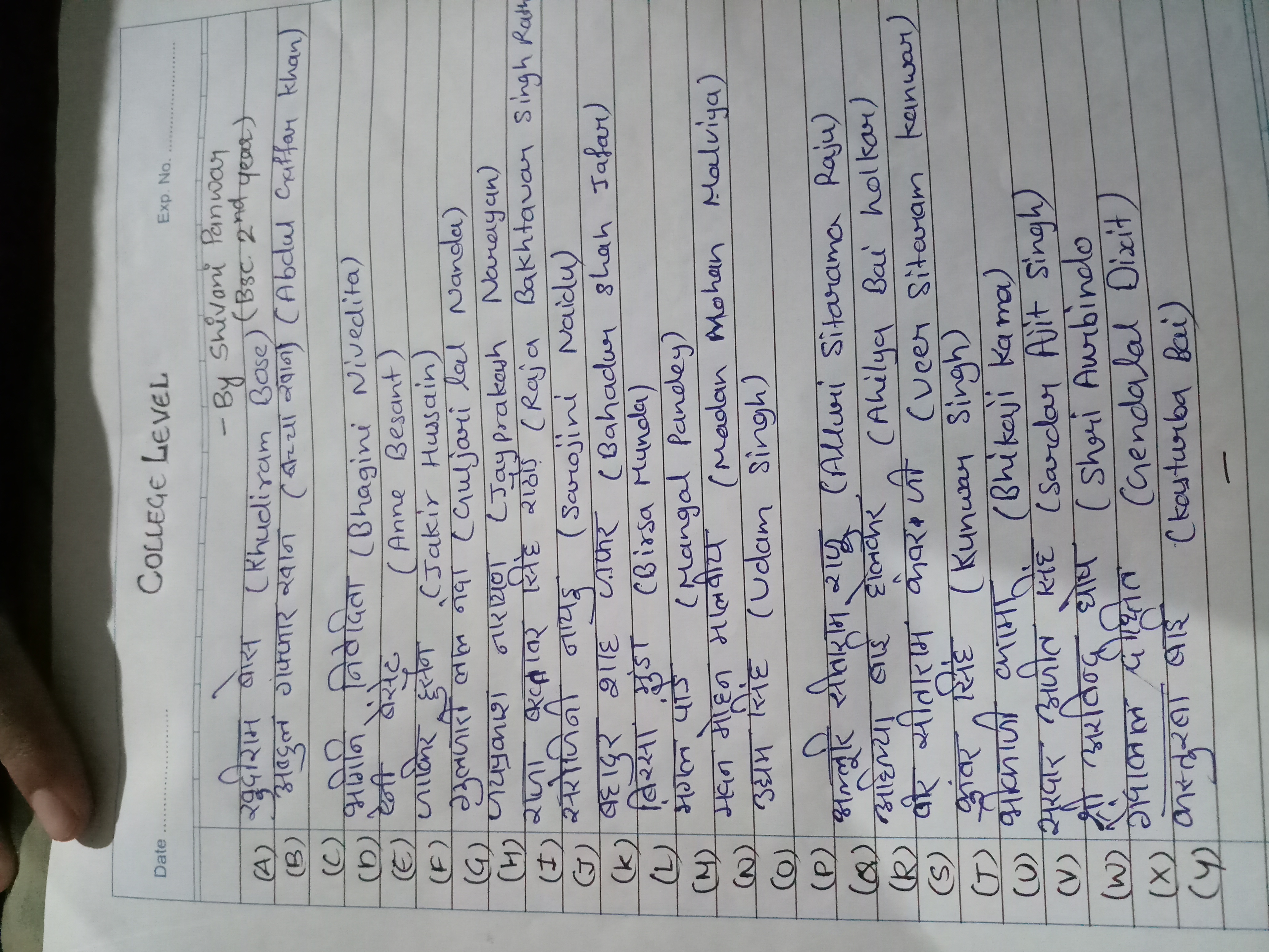 A- खुदीराम बोस,B-अब्दुल गफ्फार खान,C-भगत सिंह,D-विजय शंकर,E-एनी बेसेंट,F-डॉ जाकिर हुसैन G-लाल बहादुर शास्त्री H- जयप्रकाश नारायण I-गुरु गोवंदसिंह J-सरोजनी नायडू K-बहादुर शाह ज़फ़र L- बिरसा मुंडा M-मंगल पाण्डे N-मदन मोहन मालवीय O-उधम सिंह,P-महाराणा प्रताप Q-रविन्द्र नाथ टैगोर R-देवी अहिल्यबाई S-बाबूराव पुलेसुर बापू शेड माके T- राघोजी भांगरे U-भीका जी कामा V-सरदार अजीत सिंह W-अरविंद घोष X- पं गेंदालाल दीक्षित Y- उषा मेहता ।