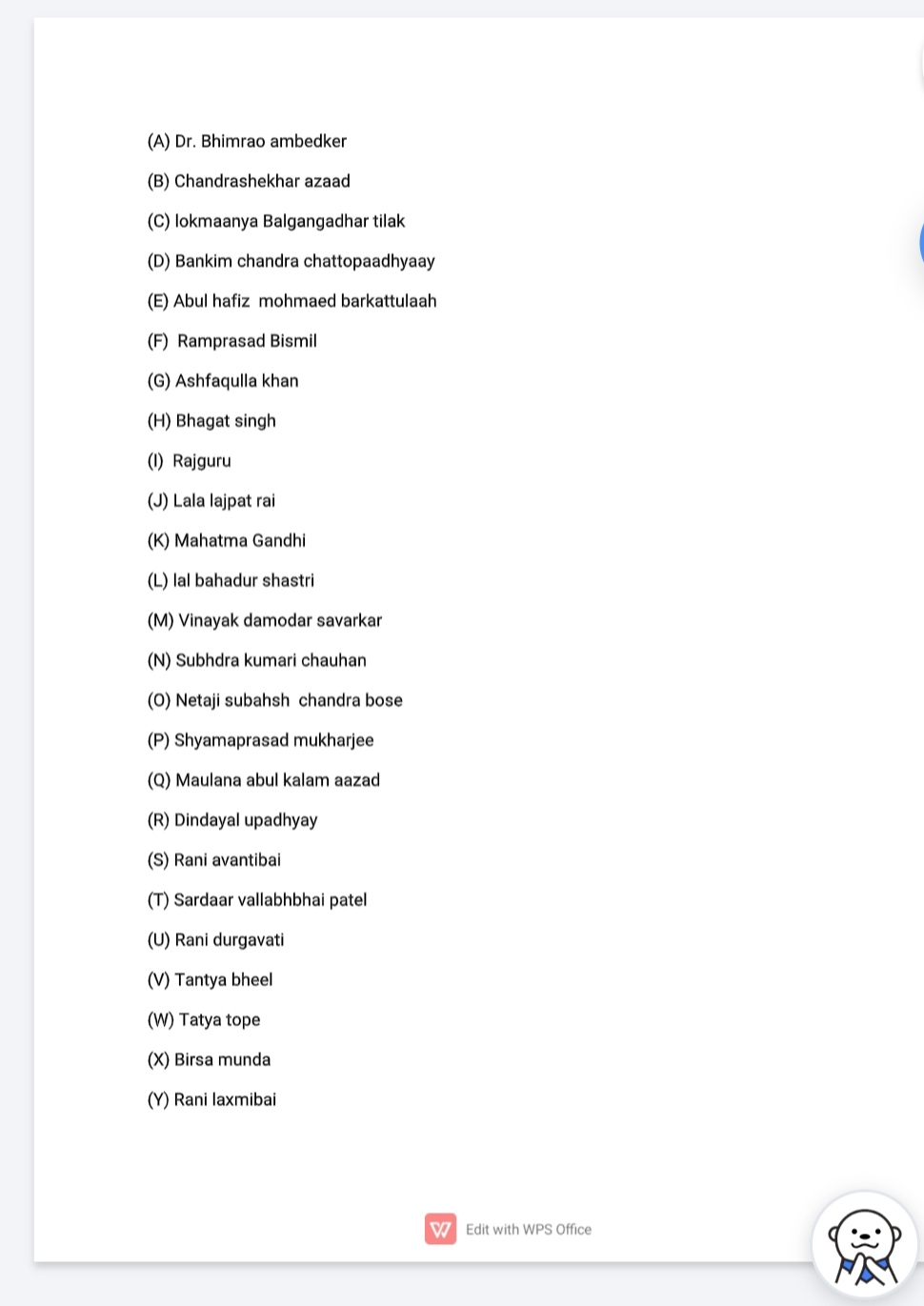 Mahatmagandhi,bhagat singh,rani laxmibai,tatyatope,sardarvallabhbhai patel