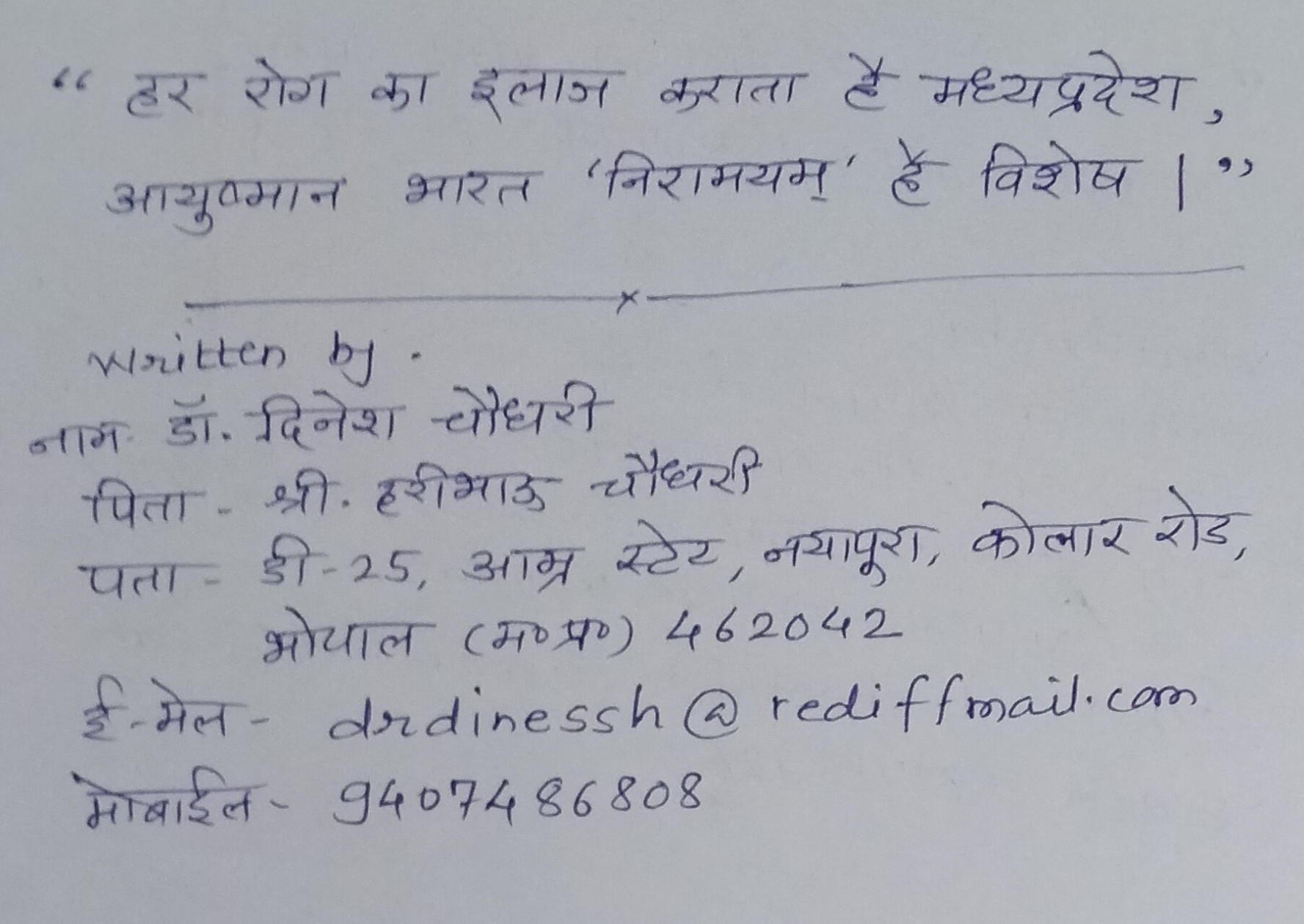 आयुष्मान भारत "निरामयम्" म.प्र. और जन स्वास्थ्य सुरक्षा पर केंद्रित स्लोगन लेखन प्रतियोगिता