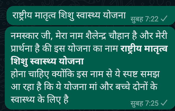 [8/6, नमस्कार जी, मेरा नाम शैलेन्द्र चौहान है और मेरी प्रार्थना है की इस योजना का नाम *राष्ट्रीय मातृत्व शिशु स्वास्थ्य योजना*