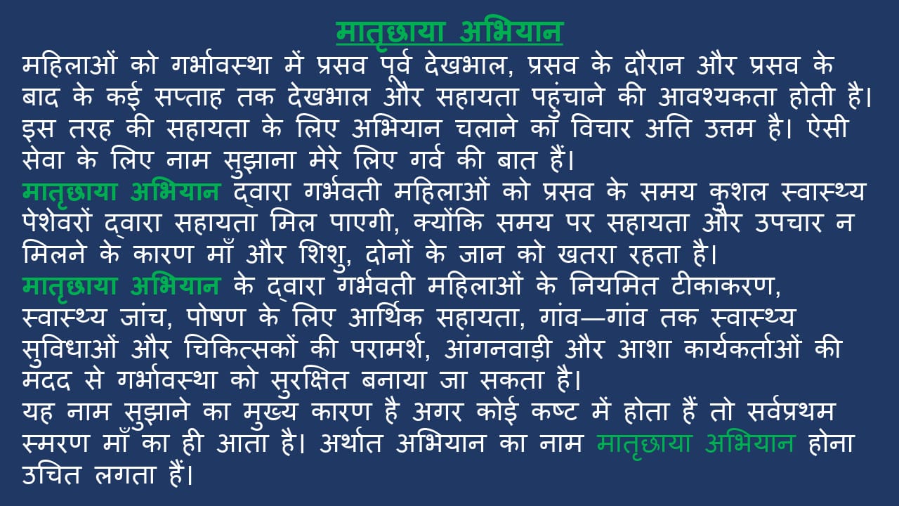 महिलाओं को गर्भावस्था में प्रसव पूर्व देखभाल, प्रसव के दौरान और प्रसव के बाद के कई सप्ताह तक देखभाल और सहायता पहुंचाने की आवश्यकता होती है। इस तरह की सहायता के लिए अभियान चलाने का विचार अति उत्तम है। ऐसी सेवा के लिए नाम सुझाना मेरे लिए गर्व की बात हैं।मातृछाया अभियान द्वारा गर्भवती महिलाओं को प्रसव के समय कुशल स्वास्थ्य पेशेवरों द्वारा सहायता मिल पाएगी, क्योंकि समय पर सहायता और उपचार न मिलने के कारण माँ और शिशु, दोनों के जान को खतरा रहता है।